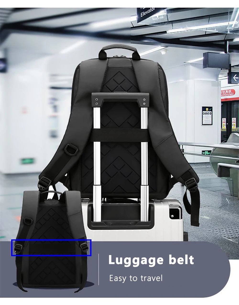 2) Gepäckgurt auf der Rückseite: Der Gepäckgurt ermöglicht es, den Rucksack einfach am Griff des Koffers zu befestigen.